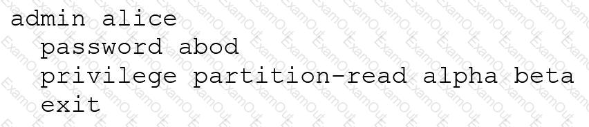 Given the following configuration, which statement describes Alice’s partition access rights?