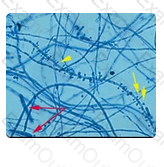 The microscopic features shown here represent Scopulariopsis species. In most instances, particularly if a patient does not have underlying immunologic or hematologic disease, Scopulariopsis species should be considered a contaminant when recovered from a sputum specimen. However, if there is clinical or X-ray evidence of mycotic pulmonary infection, additional daily induced sputum specimens should be obtained.