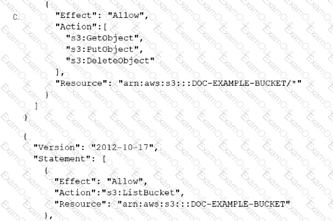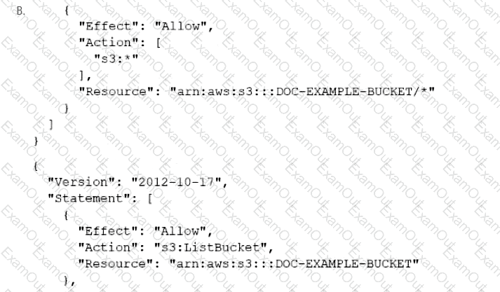 A company has an online web application that includes a product catalog. The catalog is stored in an Amazon S3 bucket that is named DOC-EXAMPLE-BUCKET. The application must be able to list the objects in the S3 bucket and must be able to download objects through an 1AM policy.