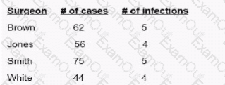 Surgical site infection (SSI) data for the previous quarter reveal the following numbers. The surgeon with the highest infection rate is Doctor