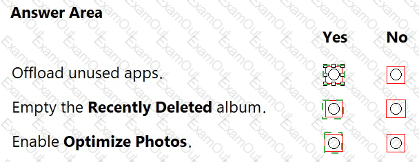 For each action, select Yes if it helps the user increase available storage, or No if it does not.