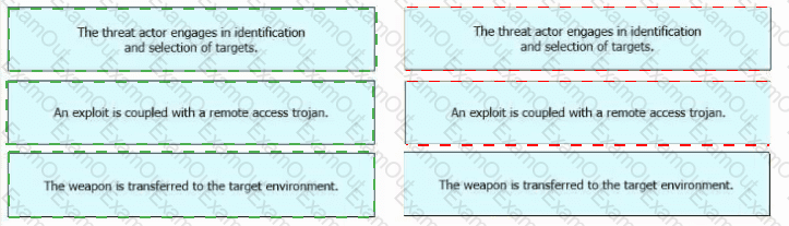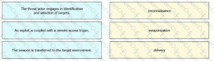 Drag and drop the definitions from the left onto the phases on the right to classify intrusion events according to the Cyber Kill Chain model.