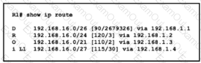 Which route does R1 select for traffic that is destined to 192 168.16.2?