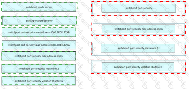 An engineer is tasked to configure a switch with port security to ensure devices that forward unicasts multicasts and broadcasts are unable to flood the port The port must be configured to permit only two random MAC addresses at a time Drag and drop the required configuration commands from the left onto the sequence on the right Not all commands are used.