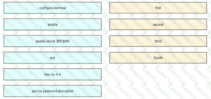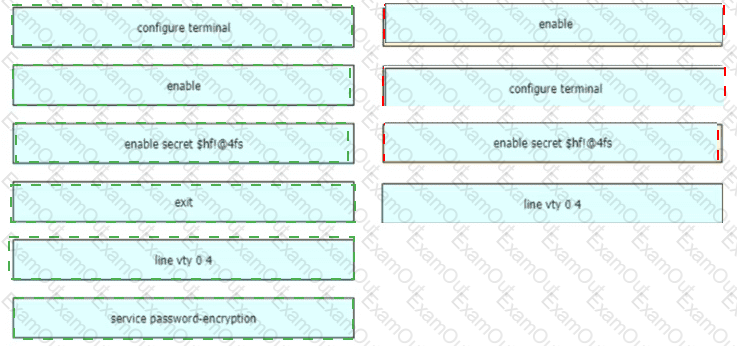 An engineer is configuring an encrypted password for the enable command on a router where the local user database has already been configured Drag and drop the configuration commands from the left into the correct sequence on the right Not all commands are used