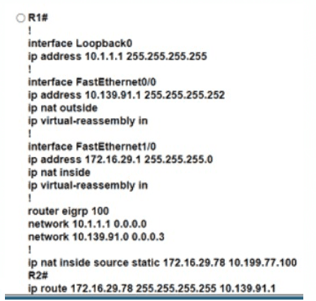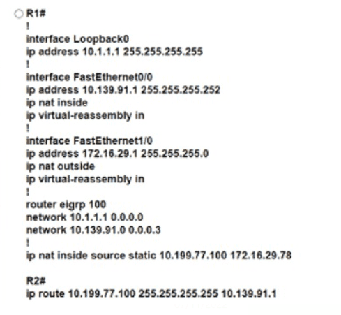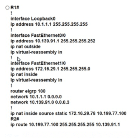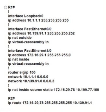 Refer to the exhibit. An engineer must translate the PC1 IP address to 10.199.77.100 and permit PC1 to ping the loopback 0 on router R2. What command set must be used?