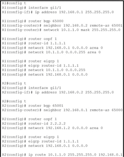 Router R2 is configured with multiple routes to reach network 10 1.1 0/24 from router R1. What protocol is chosen by router R2 to reach the destination network 10.1 1 0/24?