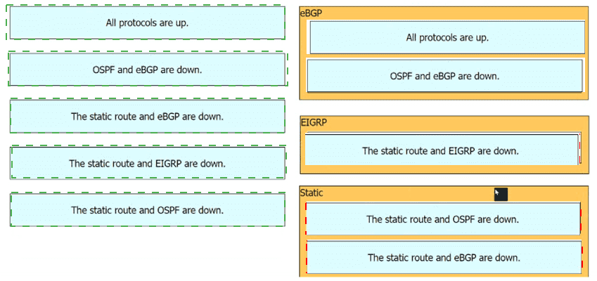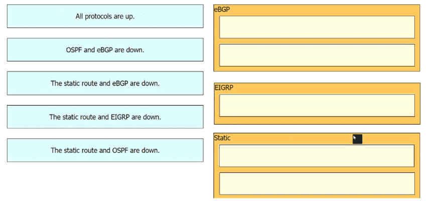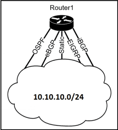 The Router1 routing table has multiple methods to reach 10.10.10.0/24 as shown. The default Administrative Distance is used. Drag and drop the network conditions from the left onto the routing methods that Router1 uses on the right.