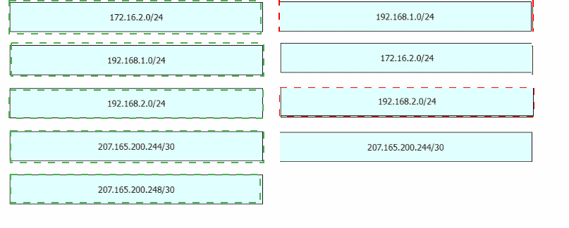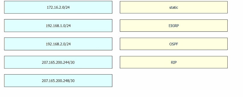 Refer to the exhibit. Drag and drop the learned prefixes from the left onto the preferred route methods from which they were learned on the right.