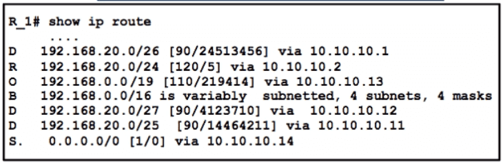 Packets are flowing from 192.168 10.1 to the destination at IP address 192.168.20 75. Which next hop will the router select for the packet?
