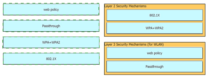 Drag and drop the Cisco Wireless LAN Controller security settings from the left onto the correct security mechanism categories on the right.