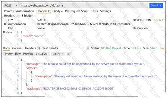 A developer wants to create a room named cisco through Webex API. The developer prepares the request by putting an API token inside the authorization header; however, the given HTTP call returns error code 400. How must the call parameters be changed to ensure a valid response?