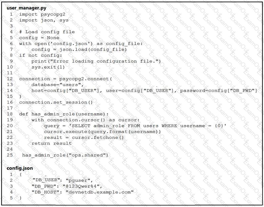 the Python script to automate the process. The script connects to the database and runs a query. What is a security issue about the secrets in the code that relates to secret protection?