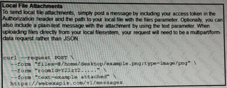 A developer needs to upload a local file by using the REST API. The developer gathers information according to the documentation and sends the request by using the cURL command in the exhibit but gets an error code. Which action should be followed to get valid response?