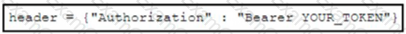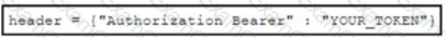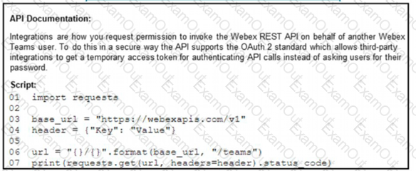 A developer creates a Python script that queries Cisco Webex. When the script is executed, a 401 code is returned. After troubleshooting, the developer discovers that the service is missing privileges. Which change to the header in line 4 of the script results in the code 200?