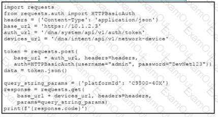 A network engineer must manage the network devices. The engineer prepares a Python scripts to authenticate to the Cisco to DNA Center API and request a device list. The device request fails and returns errors code 401. Which action solves the problem?