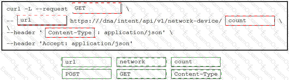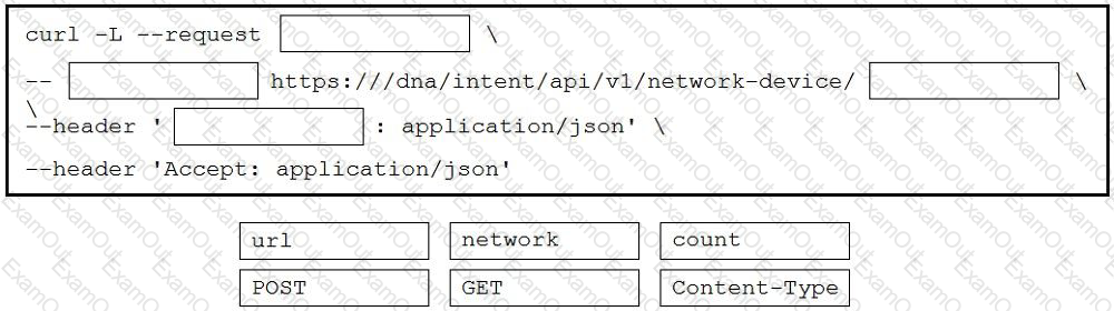 Refer to the exhibit. Drag and drop the code snippets from the bottom onto the blanks in the code to construct a request to find the Cisco DNA Center switch count. Not all options are used.