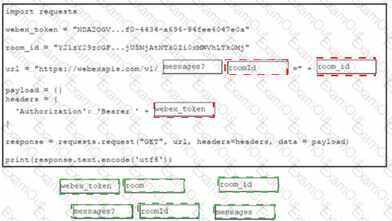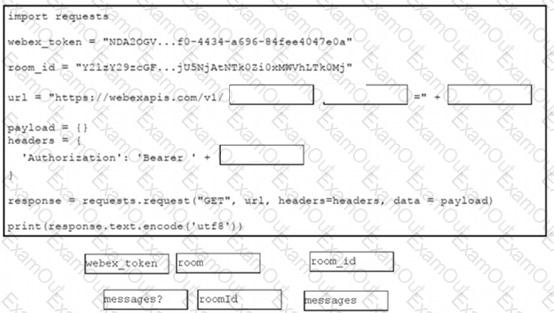 HY2l2Y292cGFyazovL3Vz397748444YjU5NjAtNTk0ZJ0xMWVhLTk0Mj". Using the Webex API documentation shown, drag and drop the code snippets from below onto the code to complete the Python script to list all of the messages in the room. Not all options are used.