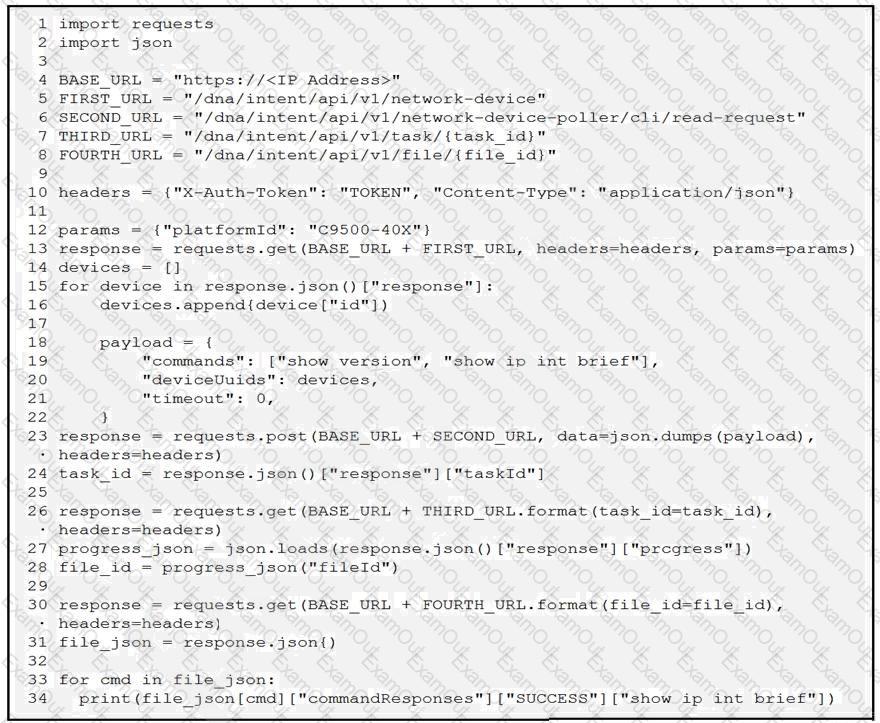 A network engineer must collect information from the network using Cisco DNA Center APIs. The script must query for the devices with 'platformId' 'C9540-x' and then send commands to be executed. Which process is automated by the Python script?