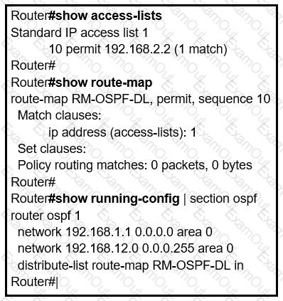 configuration that is shown. The route is still present in the routing table as an OSPF route. Which action blocks the route?