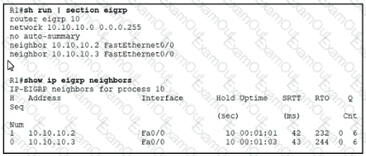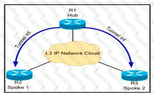 Refer to the exhibit The remote branch locations have a static neighbor relationship configured to R1 only R1 has successful neighbor relationships with the remote locations of R2 and R3, but the end users cannot communicate with each other. Which configuration resolves the issue’