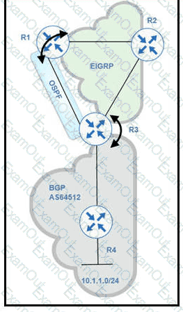 BGP and EIGRP are mutually redistributed on R3, and EIGRP and OSPF are mutually redistributed on R1. Users report packet loss and interruption of service to applications hosted onthe 10.1.1.0724 prefix. An engineer tested the link from R3 to R4 with no packet loss present but has noticed frequent routing changes on R3 when running the debug ip route command. Which action stabilizes the service?