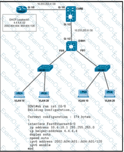 Clients on ALS2 receive IPv4 and IPv6 addresses but clients on ALS1 receive only IPv4 addresses and not IPv6 addresses. Which action on DSW1 allows clients on ALS1 to receive IPv6 addresses?