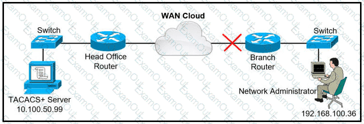 A network administrator is trying to access a branch router using TACACS+ username and password credentials, but the administrator cannot log in to the router because the WAN connectivity is down. The branch router has following AAA configuration:
