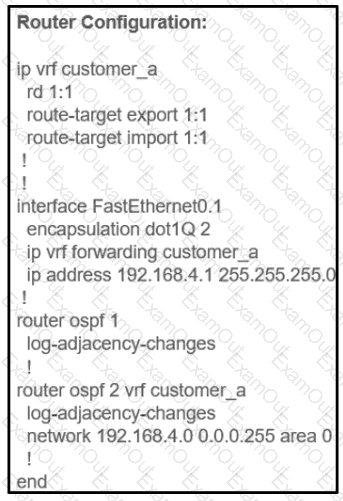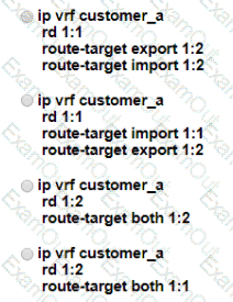 The network administrator configured VRF lite for customer A. The technician at the remote site misconfigured VRF on the router. Which configuration will resolve connectivity for both sites of customer_a?