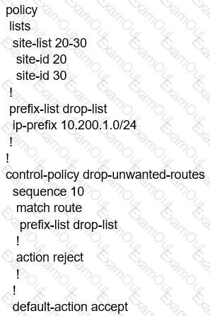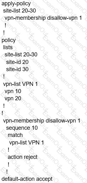 When the VPN membership policy is being controlled at the vSmart controller, which policy disallows VPN 1 at sites 20 and 30?