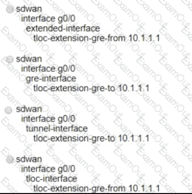 A network administrator is configuring a tunnel interface on a branch Cisco IOS XE router to run TLOC extensions. Which configuration will extend a TLOC over a GRE tunnel to another router in the branch?