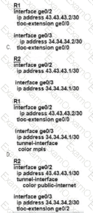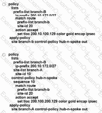 Refer to the exhibit. An engineer configures a hub-and-spoke SD-WAN topology with the requirement that traffic from router A branch to router B branch is guaranteed to flow through the network hub, router C. Which configuration meets the requirement for router A?