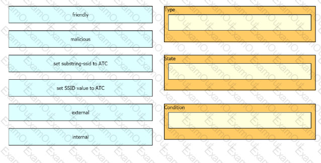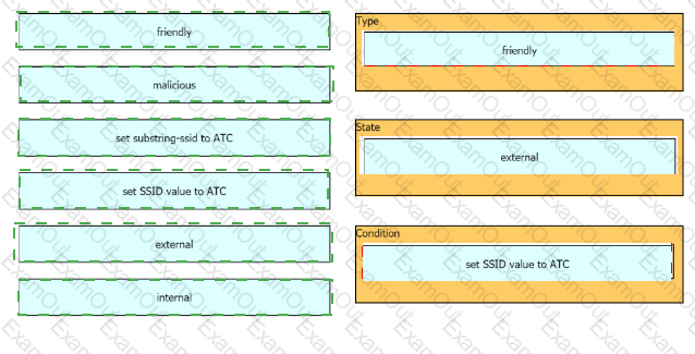 The network management team in a large shopping center has detected numerous rogue APs from local coffee shops that are broadcasting SSIDs. All of these SSIDs have names starting with ATC (for example, ATC302, ATC011, and ATC566). A wireless network engineer must appropriately classify these SSIDs using the Rogue Rules feature. Drag and drop the options from the left onto the categories in which they must be used on the right. Not all options are used.
