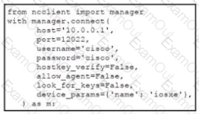 A Python script is used to configure a Cisco IOS XE device. The script must be updated to