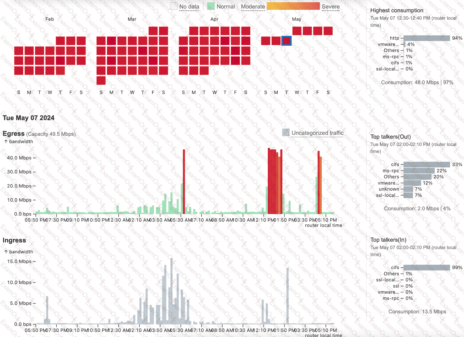 The following exhibit shows the Capacity Planning results for a router interface connected to an ISP, which provides a 1Gbps connection. Based on the evidence, which action is most likely to fix the observed behavior?