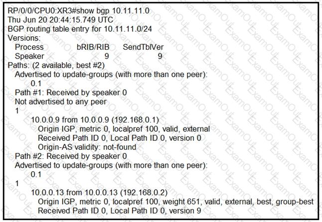 #XR3. The network operator must configure #XR3 to force the 10.11.11.0/24 prefix to route via next hop of 10.0.0.9 as primary when available. Which of these can the operator use the routing policy language for, to enforce this traffic forwarding path?
