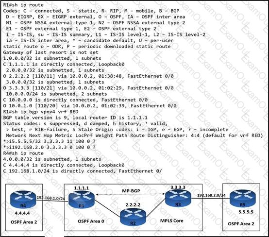 An engineer is troubleshooting connectivity issues on the MPLS core network. A customer connected through R4 cannot reach the OSPF domain on R5. While checking the routing table of R1, the engineer cannot see all the routes from R3 and R5. Which task must the engineer perform so that R4 is able to reach R5?
