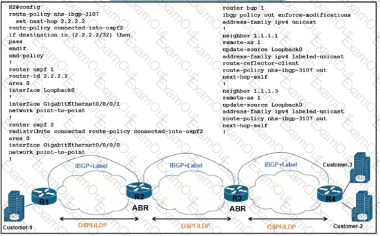 There is a connectivity issue between Customer-1 and Customer-2 File servers between the customers cannot send critical data R3 routes are missing from the routing table on the Customer-1 router All interlaces on Customer-1 are up Which configuration must be applied to router R2 to correct the problem?