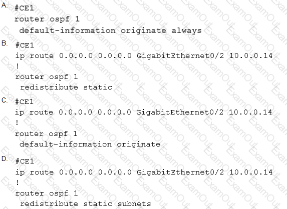 inject a default route into OSPF area 0. All devices inside area 0 must be able to reach PE1. Which configuration achieves this goal?