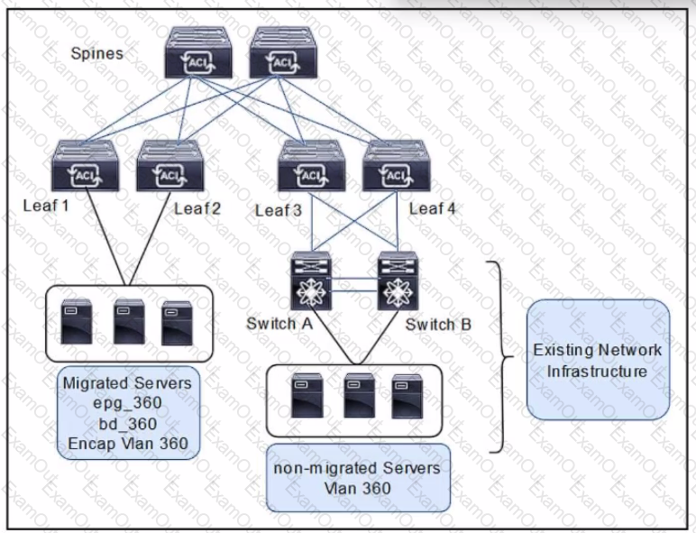 Refer to the exhibit. A client is configuring a new Cisco ACI fabric. All VLANs will be extended during the migration phase using the VPC connections on leaf switches 3. 4 and leaf switches toward the legacy network. The migration phase has these requirements;