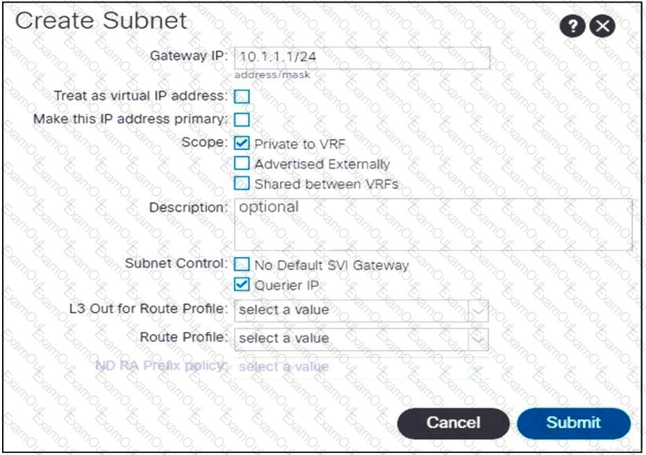 Refer to the exhibit. An engineer configures communication between the EPGs in different tenants. Which action should be taken to create the subnet?