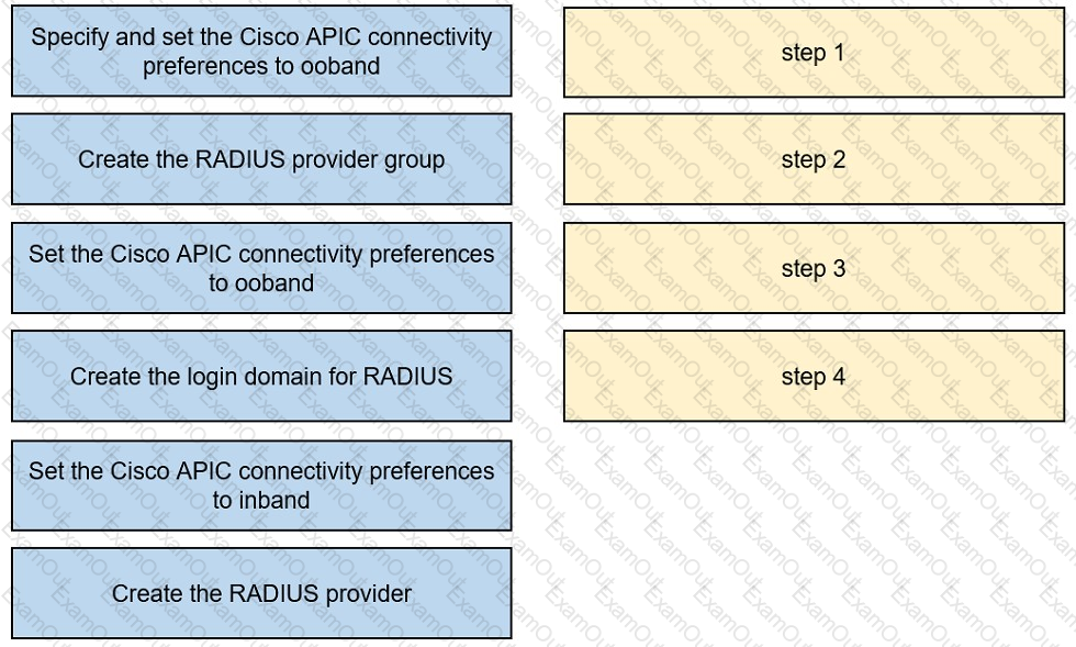 An engineer must configure RADIUS authentication with Cisco ACI for remote authentication with out-of-band management access. Drag and drop the RADIUS configuration steps from the left into the required implementation order on the right. Not all steps are used.