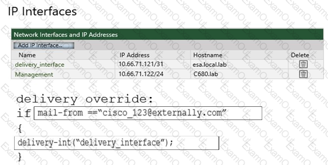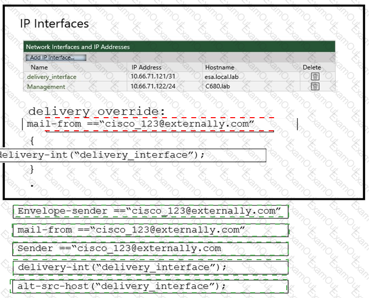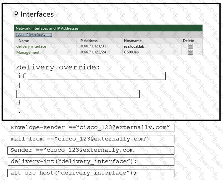 An administrator must ensure that emails sent from cisco_123@externally.com are routed through an alternate virtual gateway. Drag and drop the snippet from the bottom onto the blank in the graphic to finish the message filter syntax. Not all snippets are used.