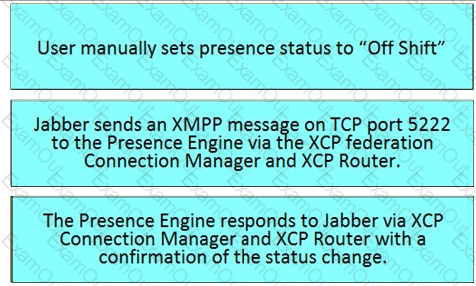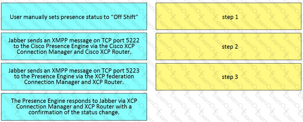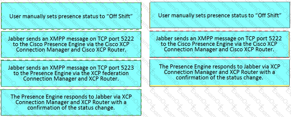 Drag and drop the steps from the left into the correct order on the right that describes the flow of presence updates when a user manually sets the presence status in Cisco Jabber. Not all options are used.
