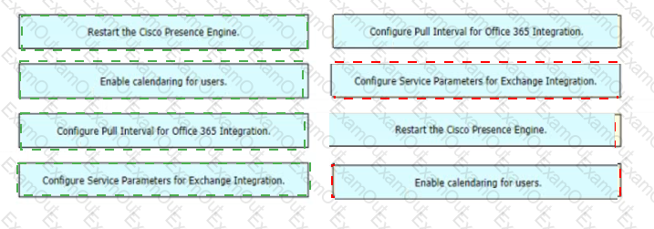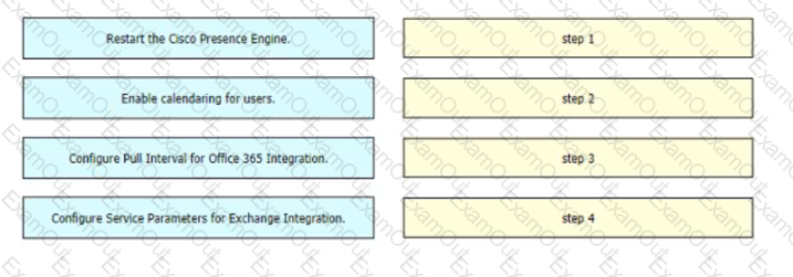 An engineer must configure Microsoft Office 365 calendar integration with Cisco IM and Presence The engineer has already configured the presence gateway Drag and drop the remaining configuration steps from the left into the correct order on the right to complete the configuration