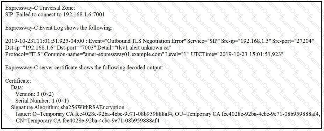 An Expressway-C and Expressway-E are configured for B2B calling and the Expressway- E zone is set to TLS Verify Currently, calls do not reach the Expressway-C. The Traversal Client zone on the Expressway-C for B2B reports the information in the exhibit for the Peer 1 address.