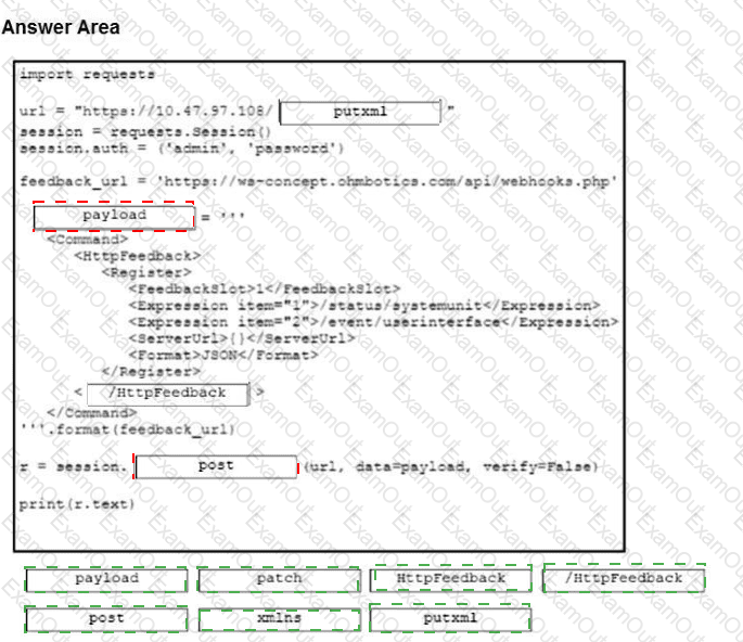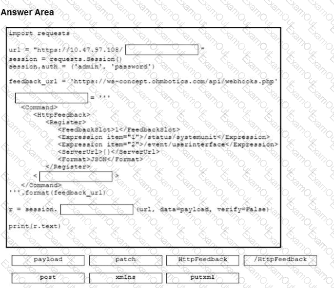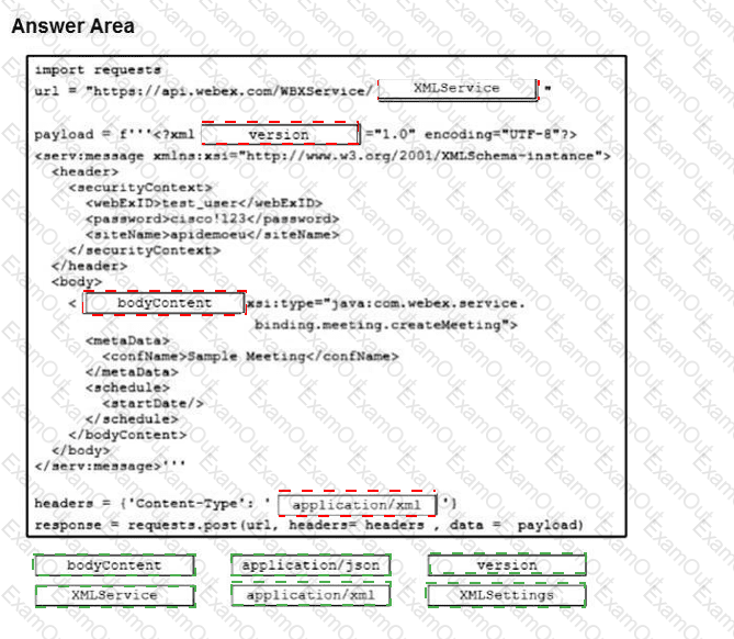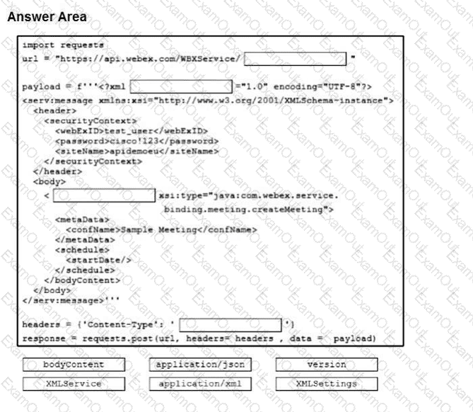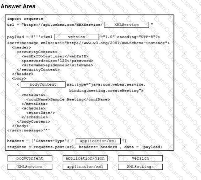 Drag and drop the code snippets from the bottom onto the blanks in the code to create a Cisco Webex CreateMeeting API request. Not all options are used.