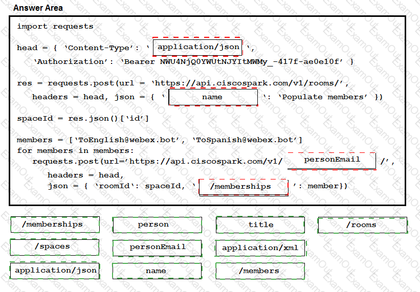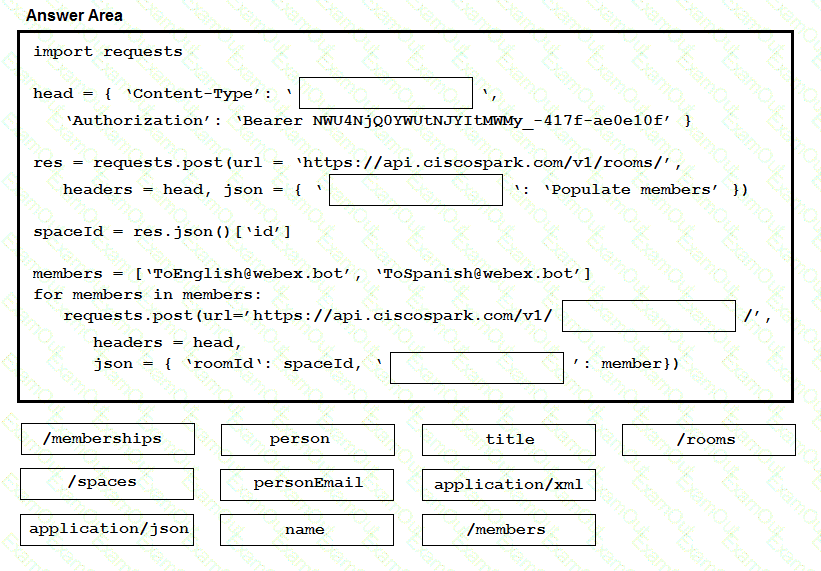 This Python script automates the creation of a Webex Teams space and adds participants to the space. Drag and drop code on the snippet to complete the script. Not all options are used.