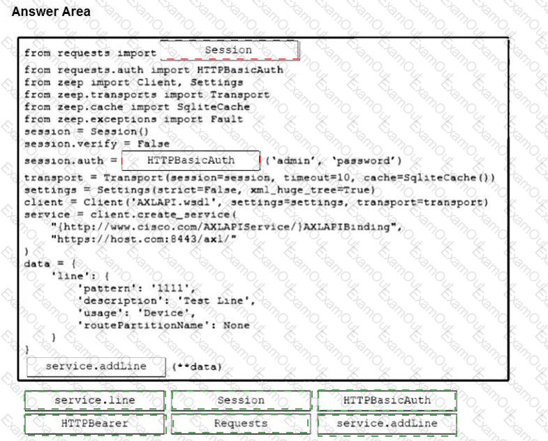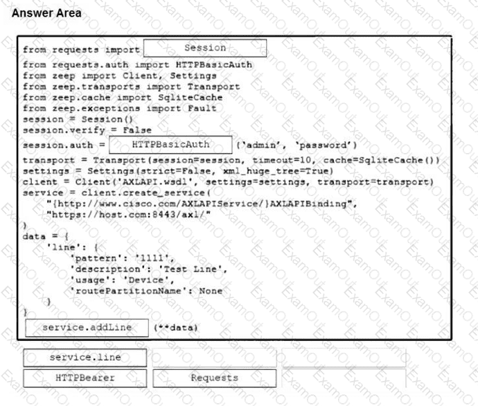 Refer to the exhibit. Drag and drop the code snippets from the bottom onto the blanks in the code to construct a Python script for Cisco UCM that
