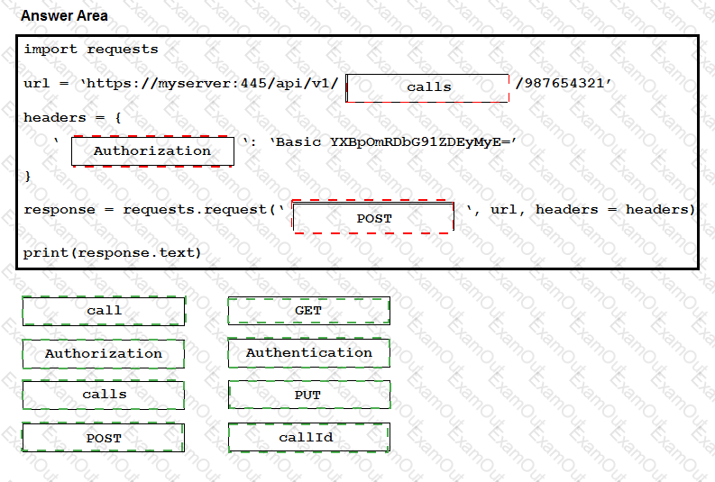 The Python script executes a REST API to retrieve information from the Cisco Meeting Server about the call with an identifier of “987654321”. Drag and drop the code onto the snippet to complete the Python script. Not all options are used.
